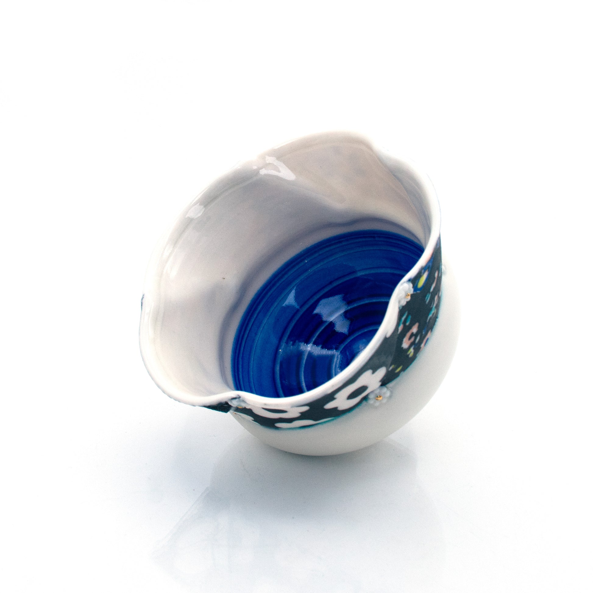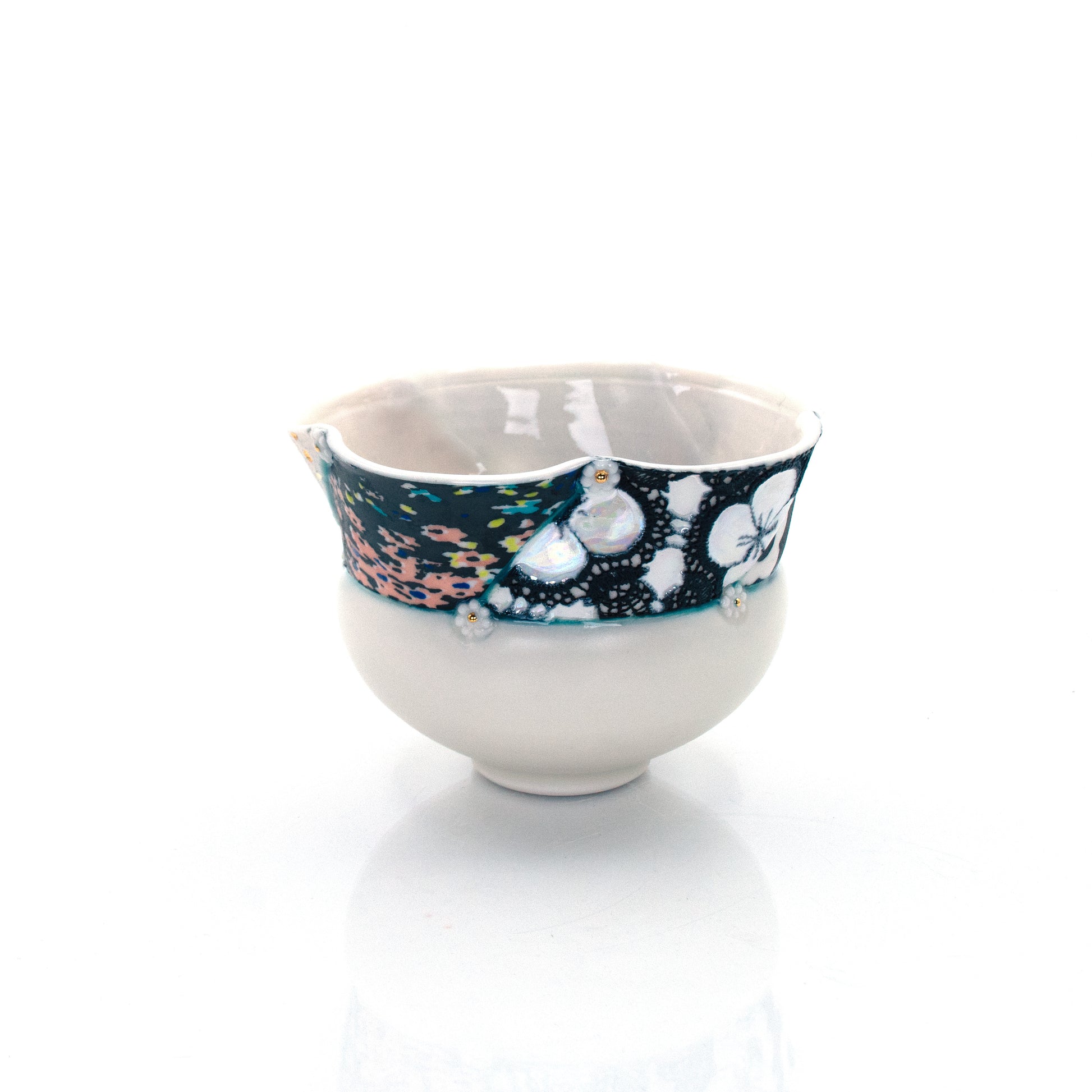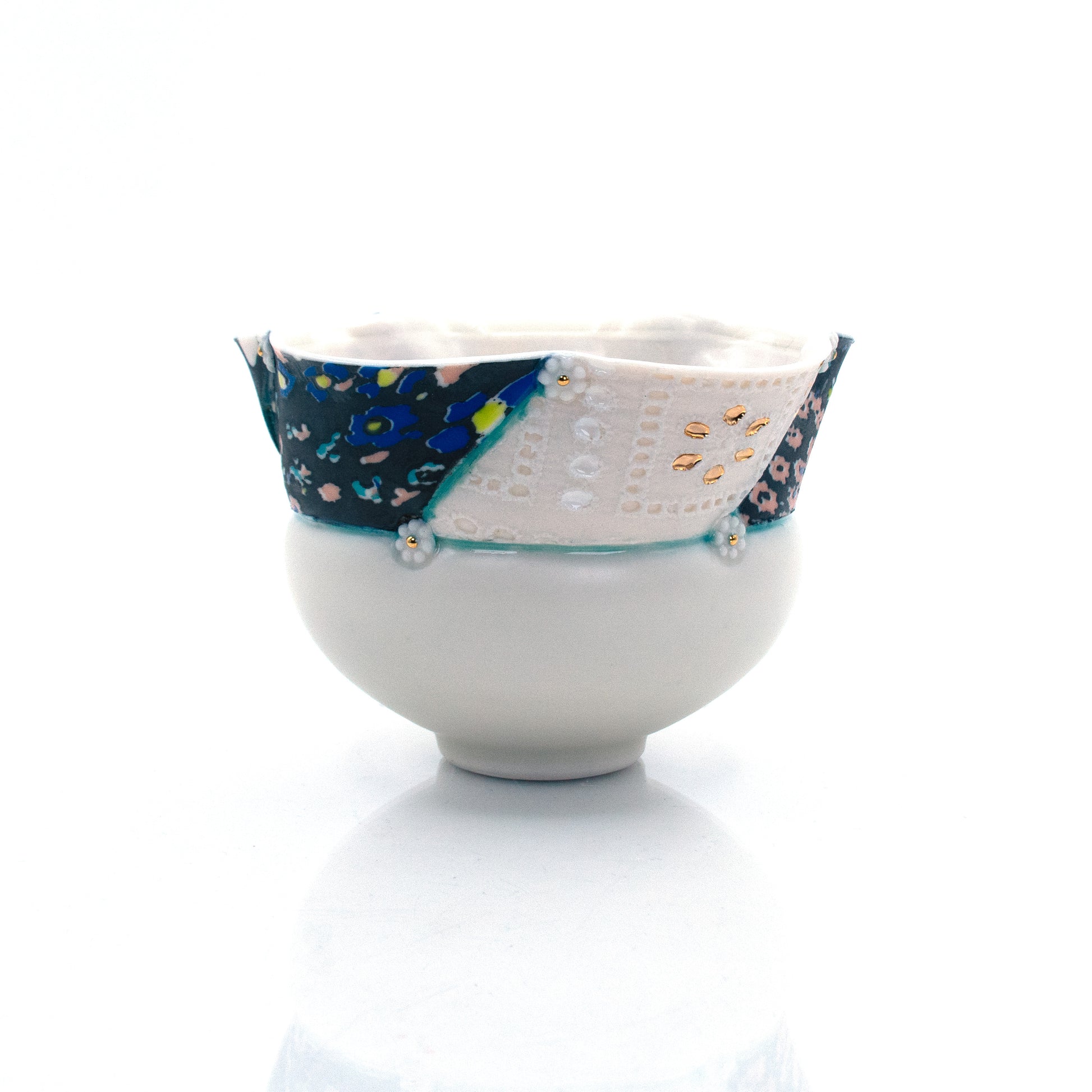 Cone 6 Translucent Porcelain with 5 panels of screenprinted underglaze print and porcelain lace with mother of pearl and gold luster. Blue underglaze swirl on the interior with a gloss glaze liner.