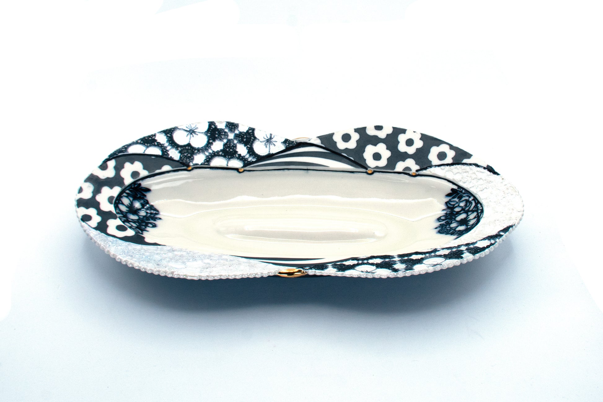 A brand new form for Briegel Ceramics. This functional piece of art that hangs on the way in case you need it to serve your favorite batch of cookies or treats. Composed of quilted together swatches of floral print and textural lace this platter will the be envy of every potluck guest.