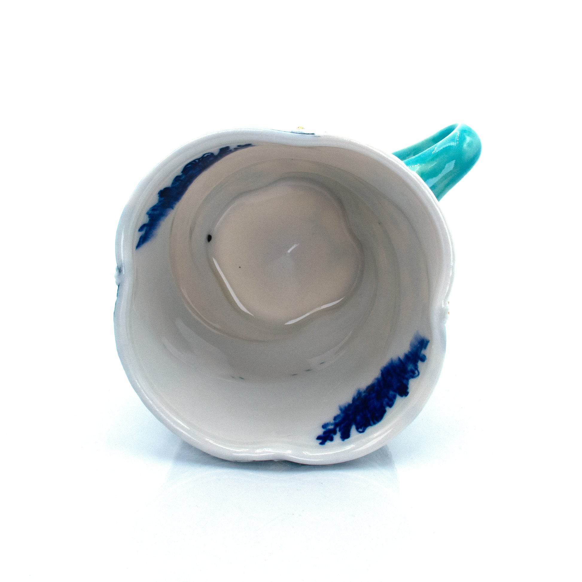 Cone 6 Translucent Porcelain with screenprinted underglaze print and porcelain lace with mother of pearl and gold luster. Black underglaze floral transfer under gloss glaze on the interior. Small black dot on the interior but is glossed over and still food safe.