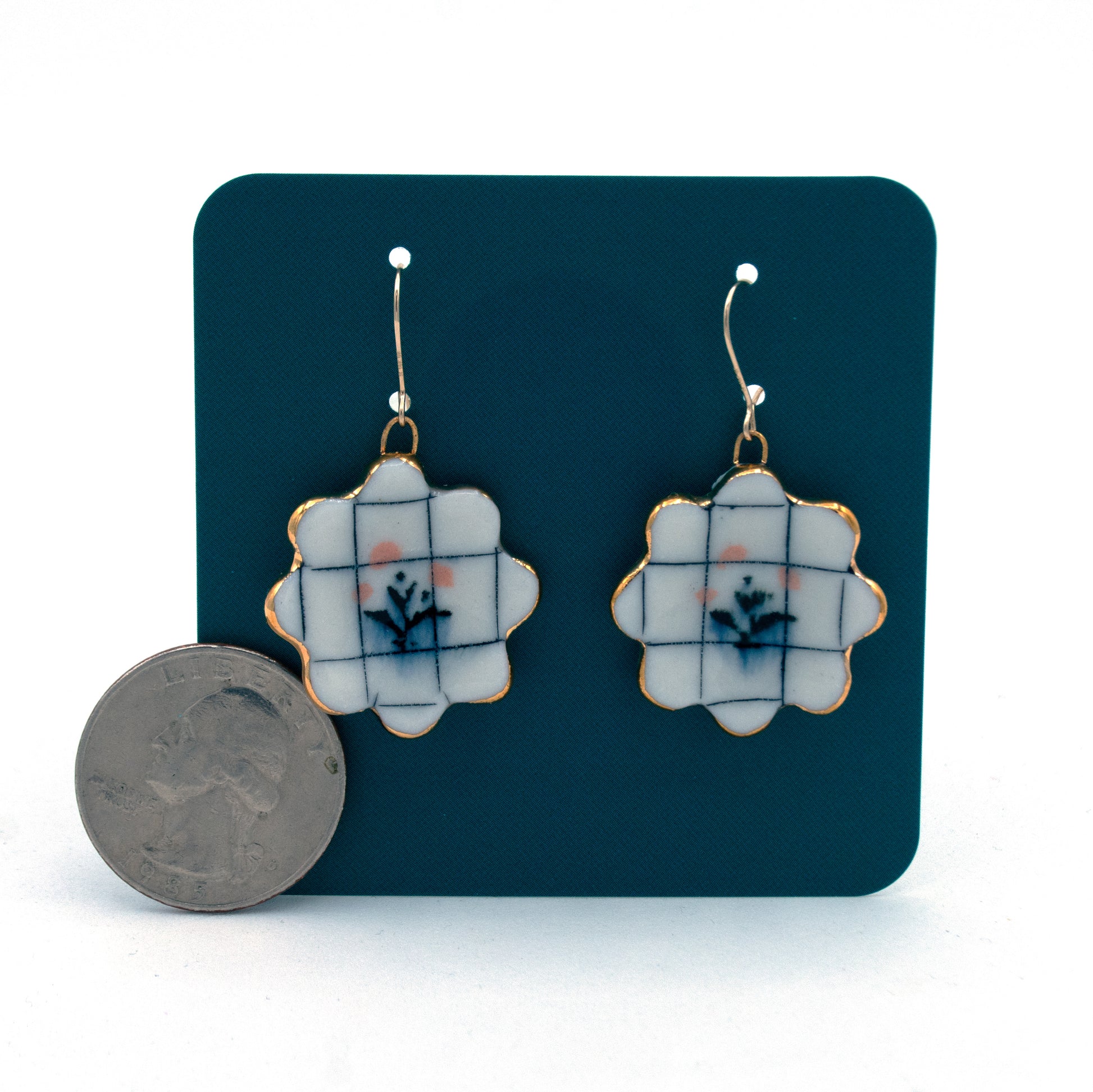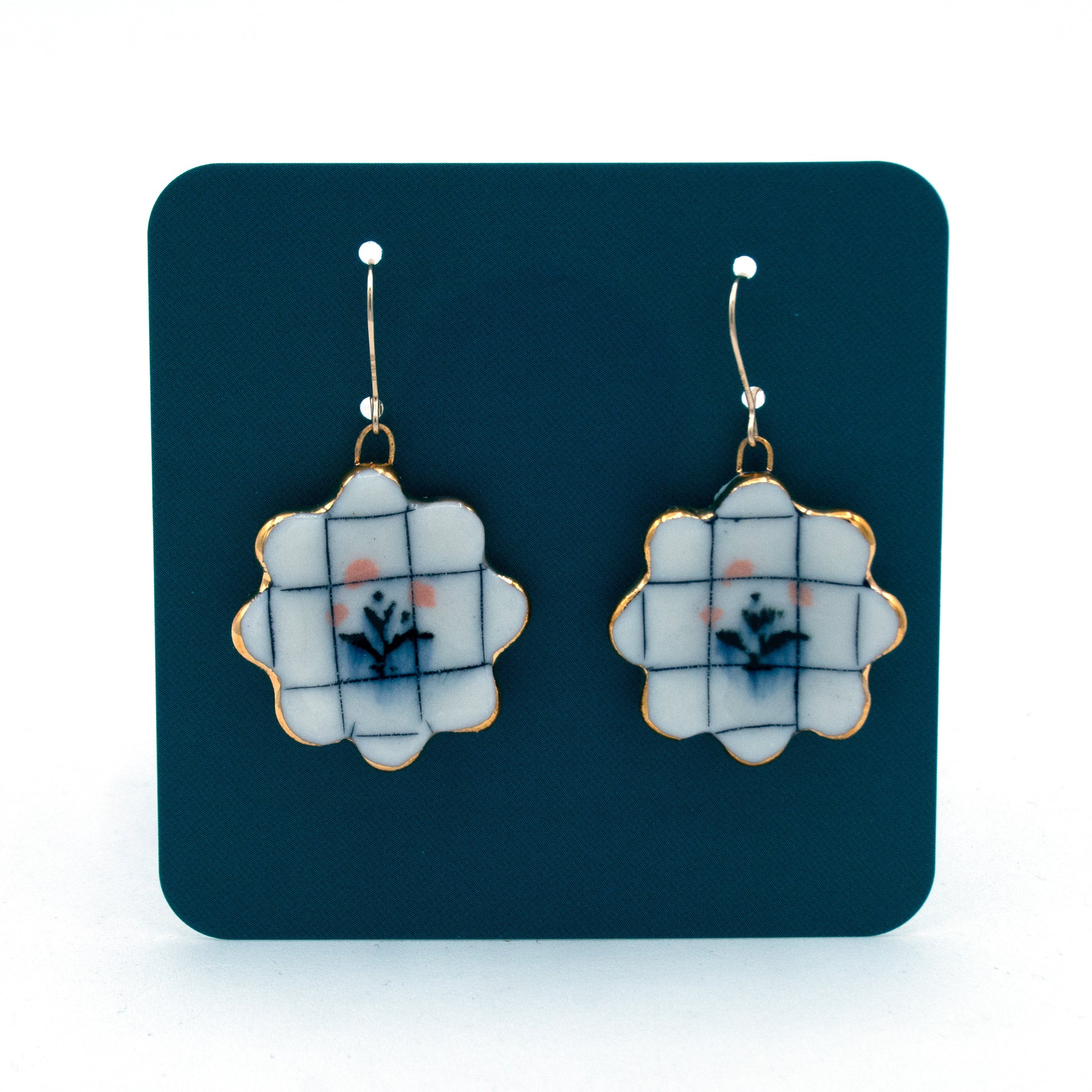 Made from a mold of a Barbie plate, these adorable miniatures are the perfect accessory that adds a touch of sweetness to any outfit. They dangle from a hypo-allergenic gold-filled ear loop and are adorned with a small floral screenprint of black and peach underglaze. The black underglaze slightly pulls down blue under the glossy clear glaze for a drippy effect.